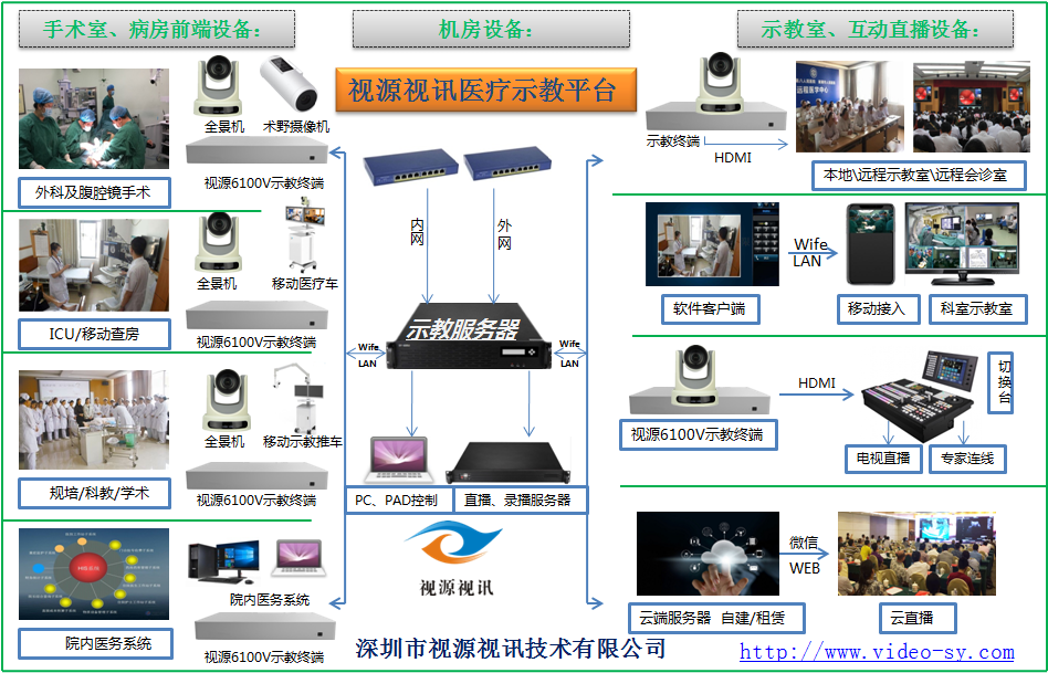手術(shù)示教終端SY-7100V、術(shù)野攝像機(jī)SY-HD900、全景攝像機(jī)SY-HD770、移動手術(shù)示教推車、視源示教管理平臺、錄播服務(wù)器SY-S980、電視墻服務(wù)器SY-S300.....
